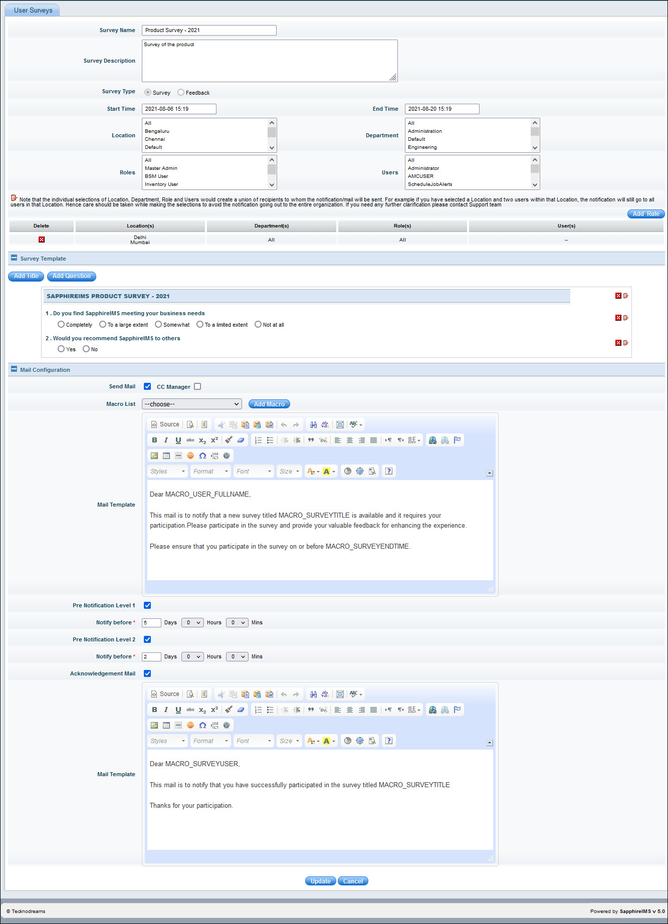 Surveys can be created and administered in SapphireIMS. The survey questions and possible responses can be configured and the survey scheduled among selected recipients. A windows can be specified during which the survey will be kept open. The survey questionnaire is made available for the participants who can login and participate. Notification and reminders can be sent. The results of the survey are analyzed and presented in a dashboard.