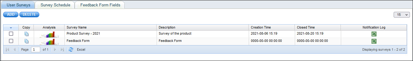 Click on an existing survey to edit or click on 'ADD' to add a new survey.