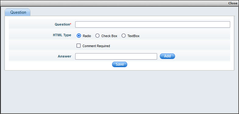 Enter the question, select the 'HTML Type' to be provided for the response (radio button or check box or Text Box) and check the box if comments are required for the question.