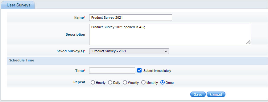 Select the 'Time' at which the survey is to be started. Check 'Submit Immediately' if the survey has to be started immediately.