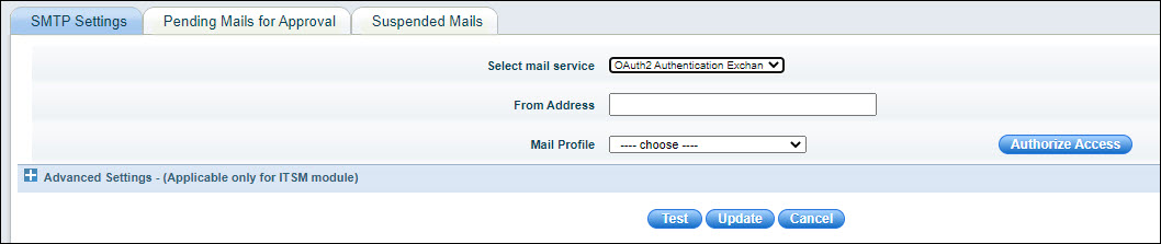 Click 'Settings' then from the 'Advanced System Settings' section click 'SMTP Settings'. The following screen is displayed. Select 'OAuth2 Authentication Exchange' as the 'Mail Service'.