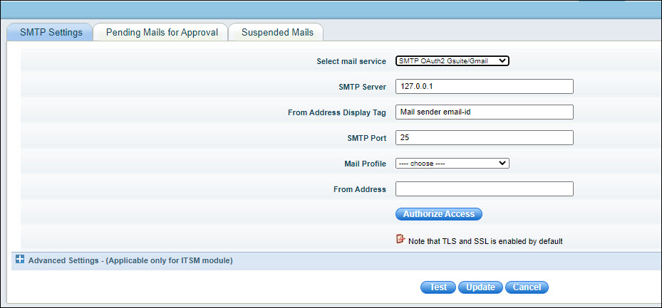 For any kind of e-mail notifications (alarms/SLA/Service request etc.) the SMTP server needs to be set correctly to send out the E-mail notifications. SapphireIMS supports SMTP and Exchange mail servers for email notifications. It also supports OAuth2 for authentication for both Exchange and GSuite/Gmail.