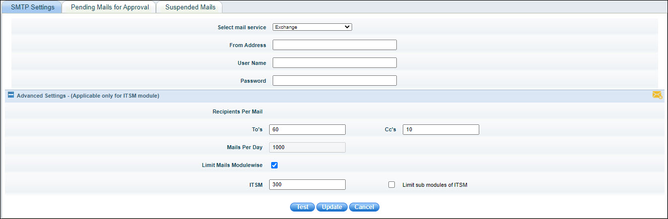 Click 'Settings' then from the 'Advanced System Settings' section click 'SMTP Settings'. The following screen is displayed. Select 'Exchange' as the 'Mail Service'.