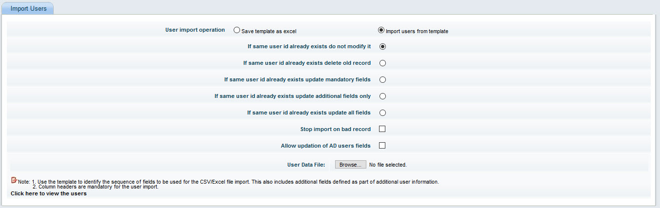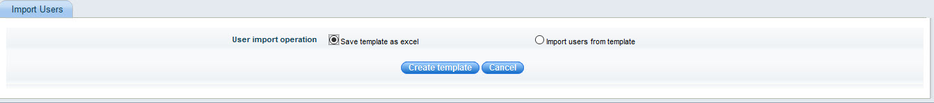 3. Click 'Create Template'. This creates an Excel sheet with column headers where user particulars should be entered. Save the user particulars template as a ‘.csv’ or '.xlxs'' file.