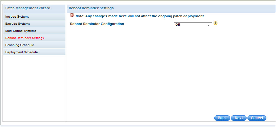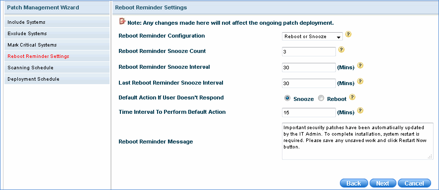 Reboot Reminder Settings: This section allows settings for reboot actions and reminders to be set. Depending on the 'Reboot Reminder Configuration' selected, certain other parameters need to be entered.