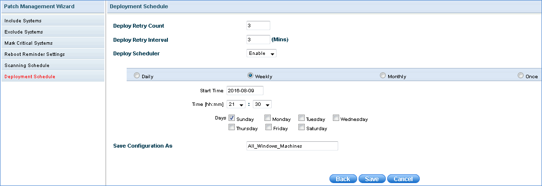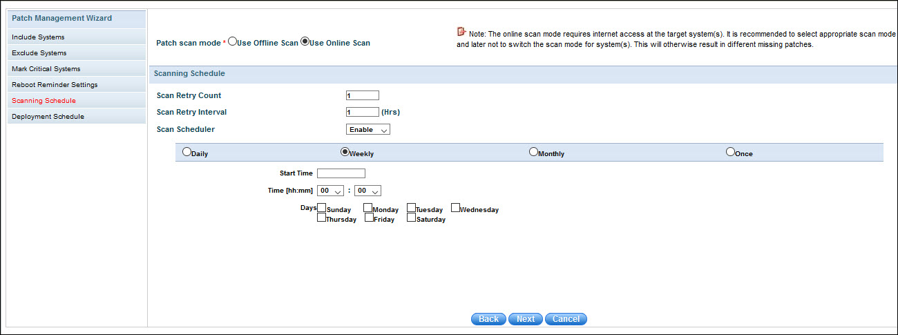 Note: Patch Scan once scheduled will be performed only if 'Scanning and Deployment' is enabled in 'Enable Patch Scanning, Deployment and Automatic Approval' section