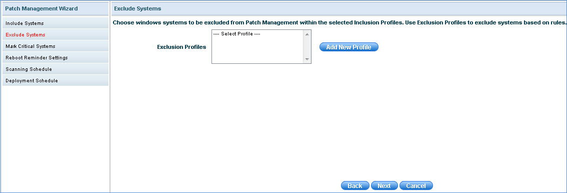 Exclude Systems: The next step is to select the exclusion profile. Devices which are part of this profile will be excluded from the patch scanning activity. To add a new exclusion profile click 'Add New Profile' button to add an exclusion profile.