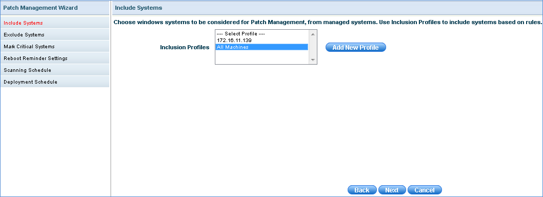 Include Systems: To add a new patch configuration, in 'Windows Patch Management Wizard' tab, click on the ‘Add’ button. The first step is to select the hosts that are to be included as part of the patch configuration. You can select an inclusion profile that is created or create a new profile using the ‘Add New Profile’ button. Make sure you select a correct profile.