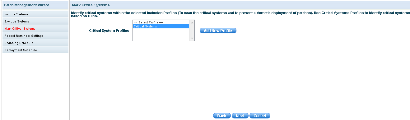 Mark Critical Systems: You can select the profile where has the critical systems defined. For systems which are set as critical systems, the patch deployment will always be only on approval. To add a new Critical System profile click on 'Add New Profile' button.