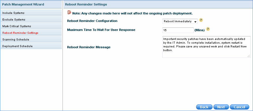 Click 'Restart Now' else the system is automatically restarted after the time interval 'Maximum Time To Wait For User Response' that is specified in the above patch management settings screen.